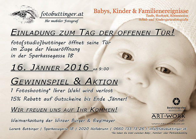 foto[studio]buttinger eröffnet am 16.1.2016 sein neues Fotostudio in der Sparkassegasse 18 und hat ab 9.00 Uhr den ganzen Tag seine Türen für Kunden und Interessenten geöffnet.